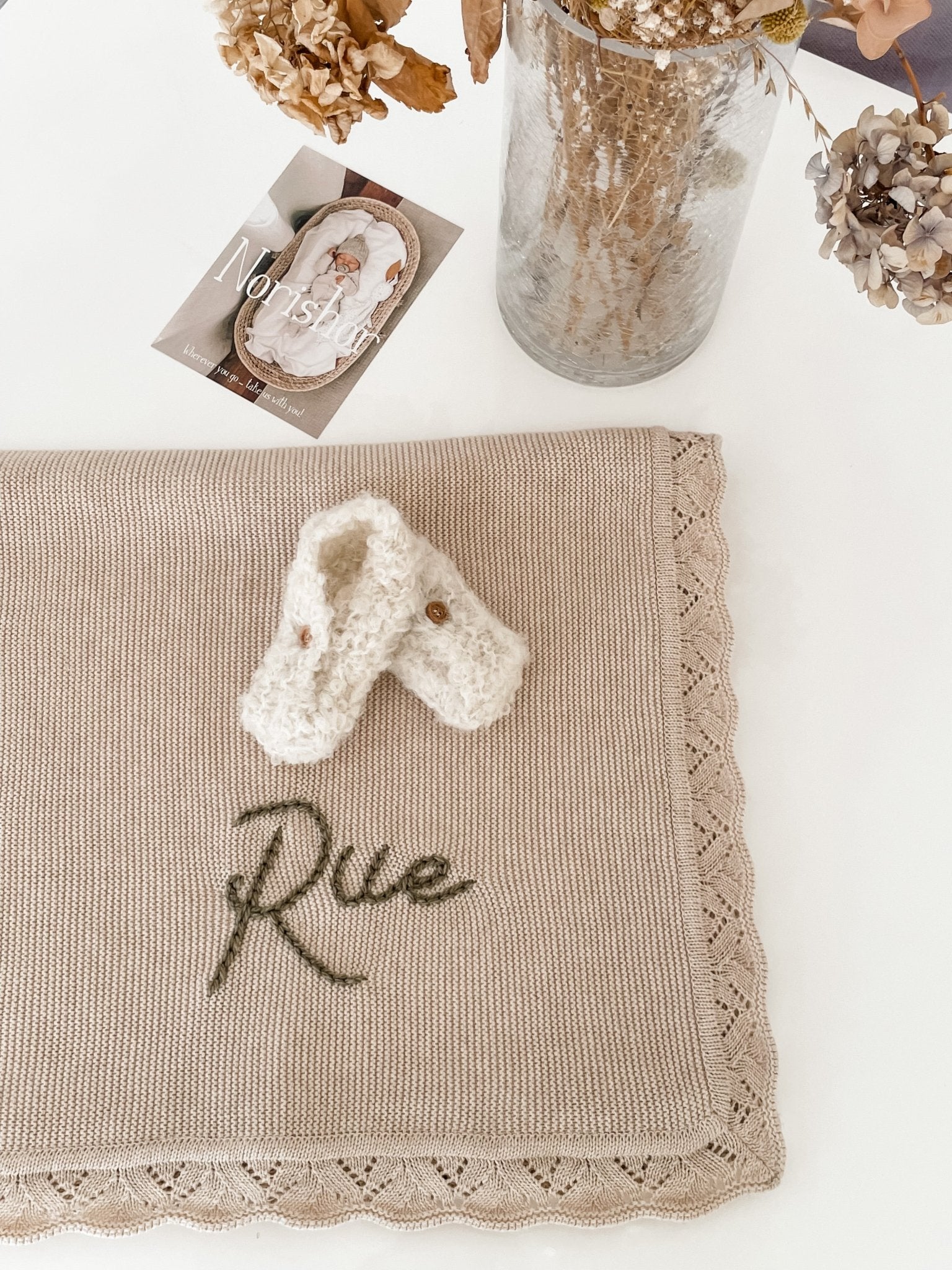 Each pair is handmade in alpaca wool which is known as being softer than cashmere and highly breathable. Hypoallergenic meaning it does not irritate the baby's sensitive skin.