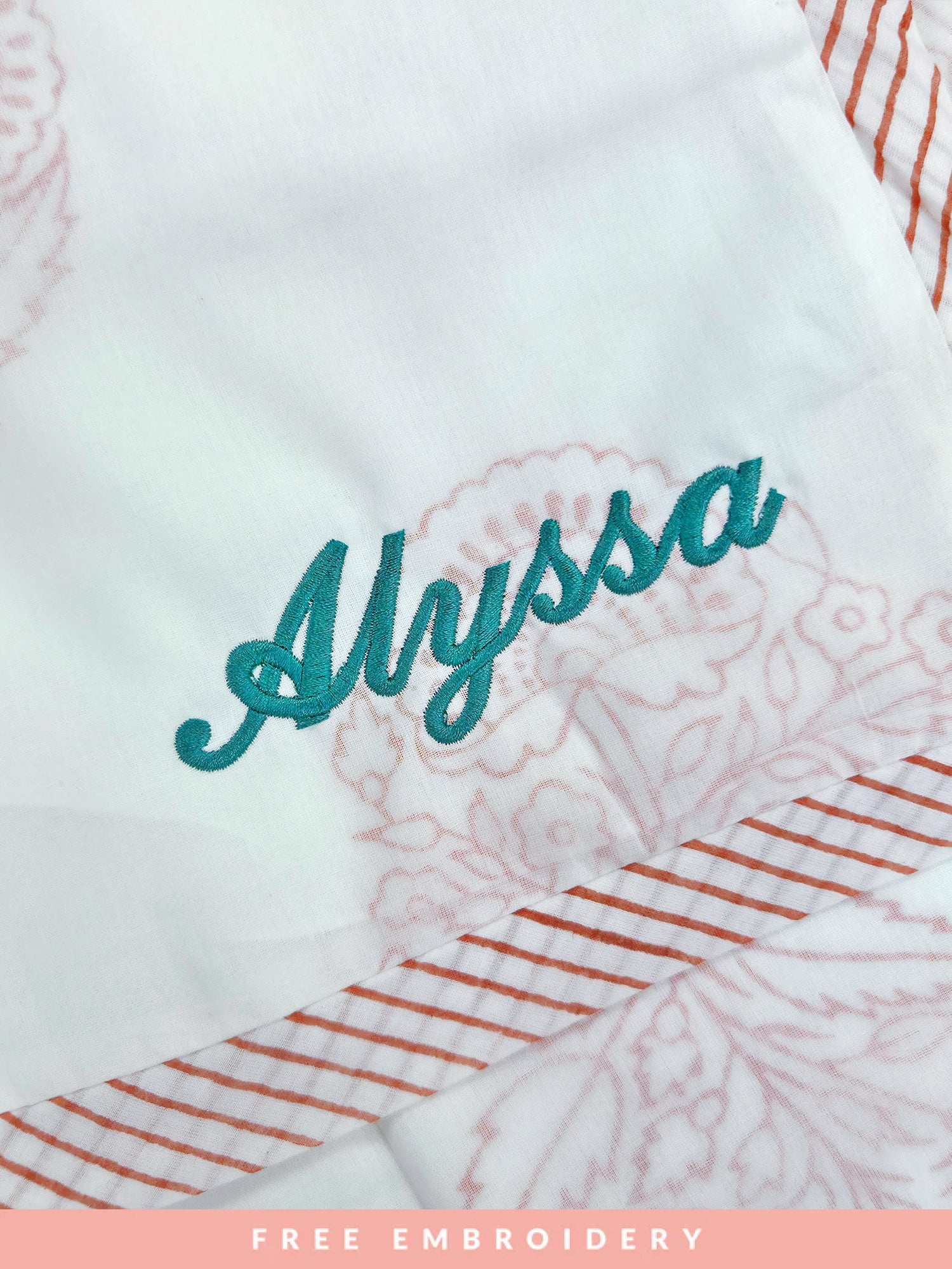 Enjoy complimentary personalization on our signature Malabar Baby Dohar blankets. An absolute favorite baby shower and newborn gift. Please note that if you opt for personalization, you order will ship after 7-10 business days and is final sale.