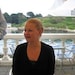A sturdy wooden ride on dog toy with fabric ears, that can be rolled along on 4 wheels.